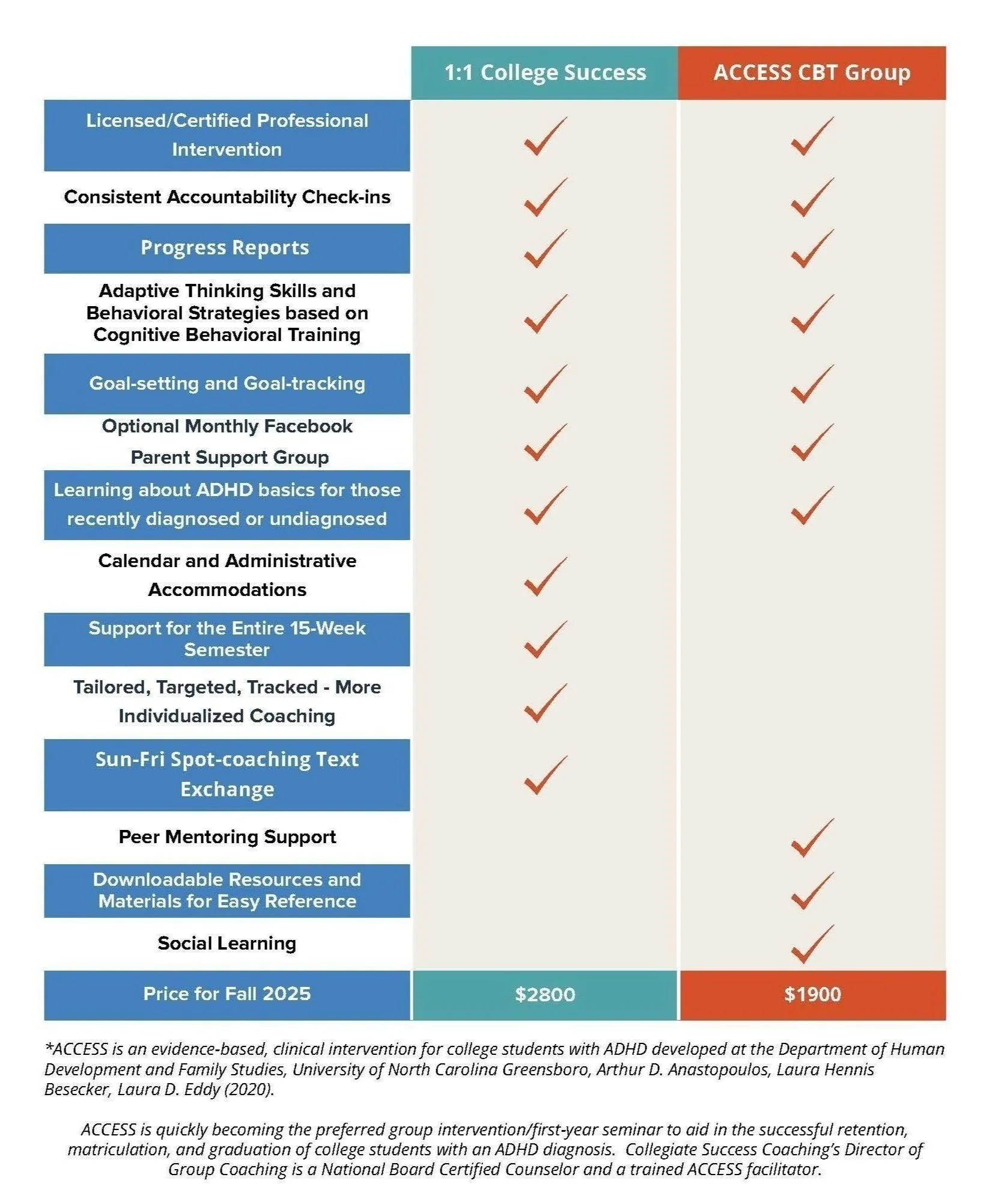 The ACCESS (Accessing Campus Connections and Empowering Student Success) program includes a weekly 90-minute interactive small group psychoeducational session with approximately 6 - 8 students representing campuses across the US led by a professional facilitator. In between the weekly group sessions, each participant meets individually with a peer mentor to tailor the concepts and strategies learned in the group to meet their own needs and goals. After the group sessions end, the student continues to meet weekly with their ACCESS Peer Mentor until the end of the semester for continued support and accountability as they implement their new knowledge and strategies.